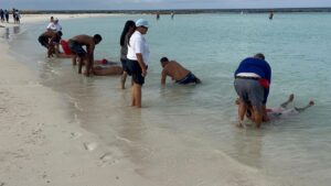 Kuater turista a hoga den yanüari na diferente sitio den e laman rondó di Aruba. No a bini muchu afó tokante e motibunan. Un kos ta sigur, segun Marla Dominguez, instruktor di salbabida na Krus Kòrá: e resultado por tabata otro si tabatin salbabida presente.